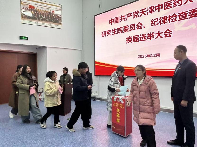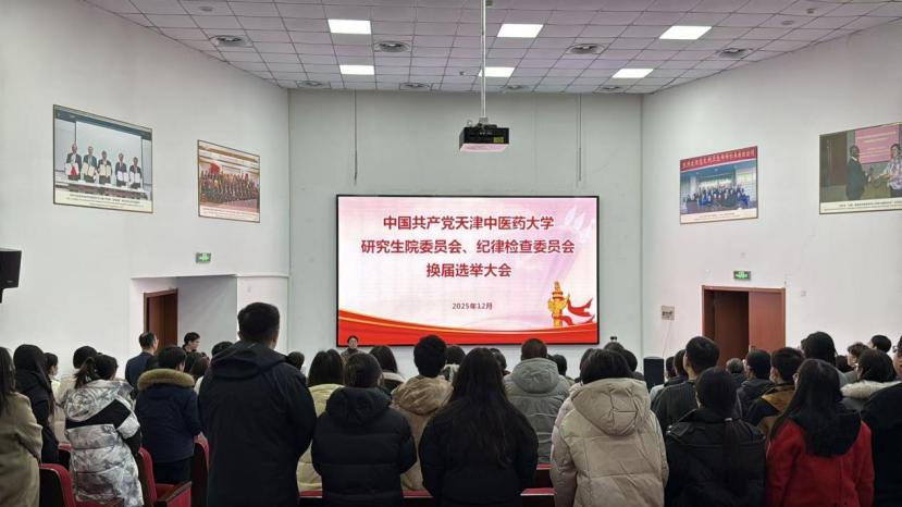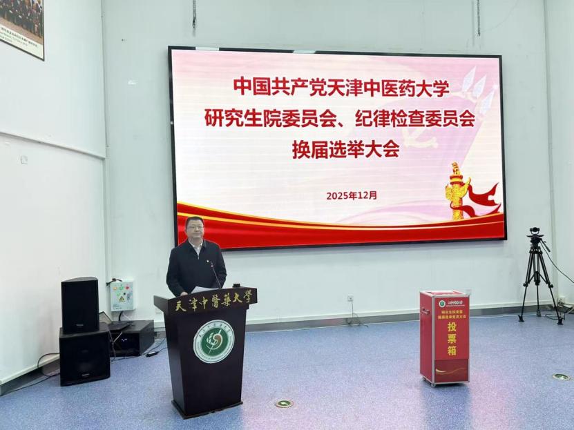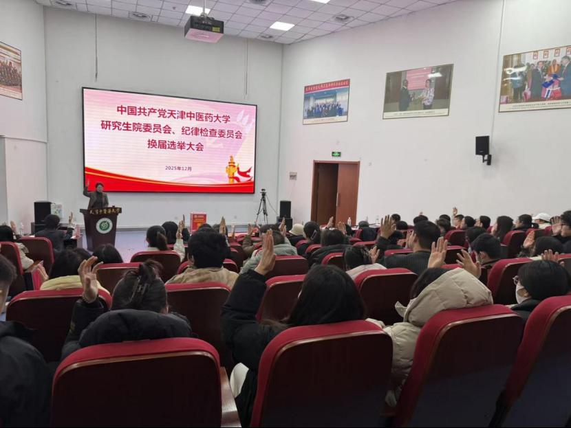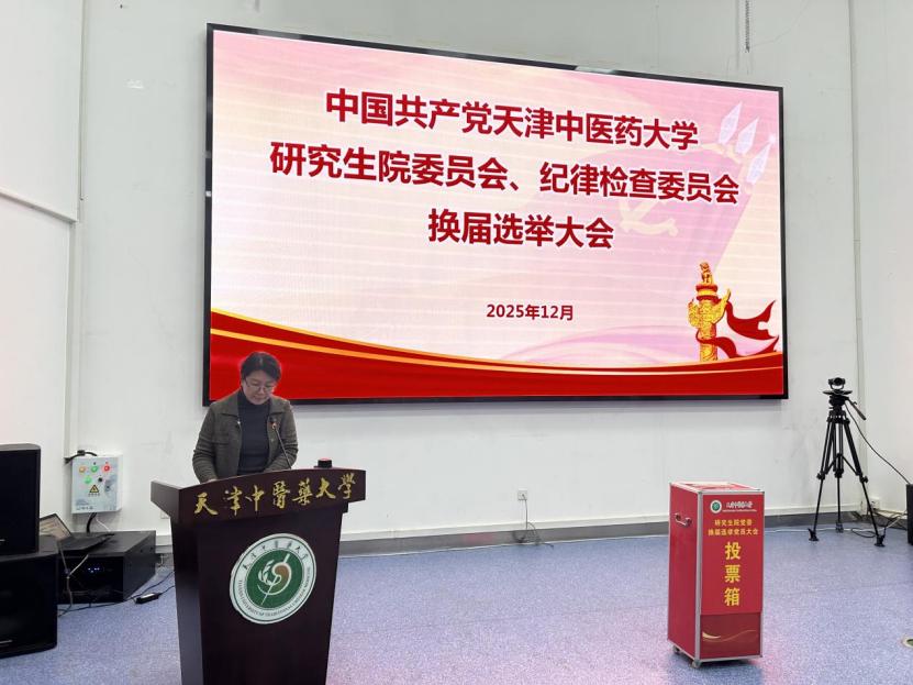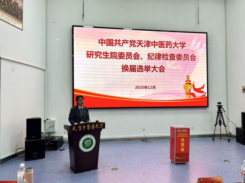 2025年12月31日,中共天津中医药大学研究生院委员会、纪律检查委员会换届选举大会在国际教育学院一楼报告厅隆重举行。大会全面总结了本届党委、纪委工作,选举产生新一届研究生院党委委员和纪委委员。校党委副书记张华泉、校党委组织部有关干部、研究生院全体正式党员参加大会。会议由研究生院党委书记耿晓丽同志主持。