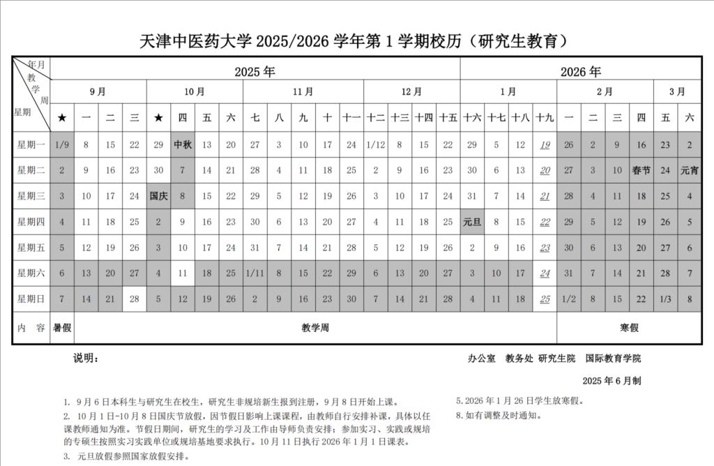 天津中医药大学2025-2026学年第1学期校历(研究生教育)