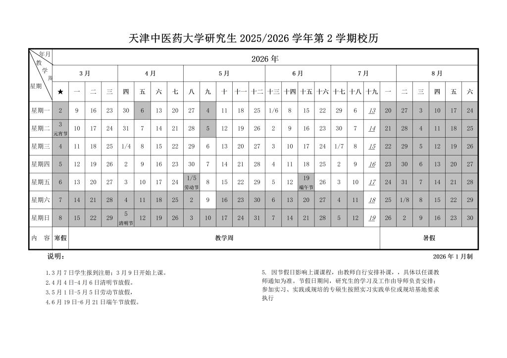 天津中医药大学研究生2025/2026学年第2学期校历