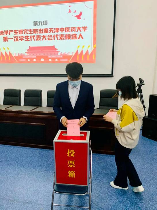 参与选举的代表应到80人,因事、因病请假0人,实到代表80人,此次会议由研究生院研究生会主席王芯蕊主持。会议在雄伟的国歌声中拉开序幕,大会开始由研究生会执行主席付天聪宣读《会议手册》中学生代表选举办法,在一致通过该办法后,全体通过监票人员、计票人员名单。研究生会执行主席陈志翰宣读研究生院出席天津中医药大学第一次学生代表大会代表候选人预备人选名单,研究生会执行主席蒋珊主持大会选举工作,采用差额预选、等额正选的方式,本着民主、公平、公正的原则,无记名投票选举产生33名学生代表。