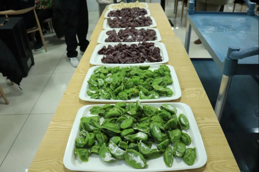 活动现场,食堂工作人员为同学们提前准备了丰富的食材和工具,有不同颜色的饺子皮,不同的馅料。大家在洗手后纷纷加入到包饺子的队伍中,分工协作,有的揉面、有的擀皮、有的包馅,手法娴熟的同学还耐心地教新手们包饺子的技巧和花样。一手拿起饺子皮,一手填馅,双手合拢一捏,一个个形态各异的饺子就成型了,一双双灵巧的手将浓浓的冬至情满满地包进了圆鼓鼓的饺子中,不一会儿一盘盘饱满诱人的饺子摆满了桌面。
